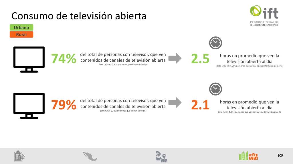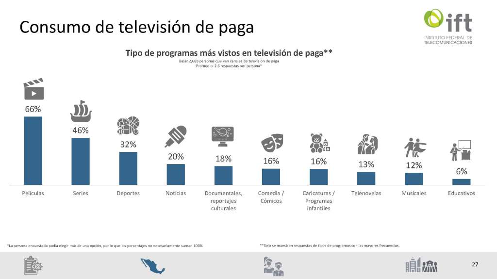 “En televisión de paga, tanto para las localidades urbanas como en las rurales, los contenidos más vistos son las películas, las series y deportes; el 35% de las personas en localidades urbanas escuchan estaciones de radio, comparado con el 33% observado en localidades rurales; los tipos de programas más escuchados en zonas urbanas y en las localidades rurales son los musicales seguidos de las noticias”.