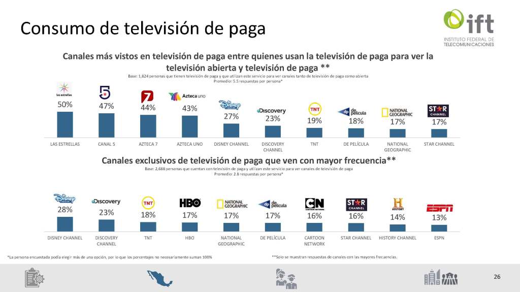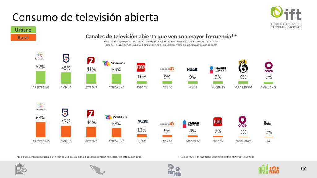 “En televisión abierta, tanto para las localidades urbanas como en las rurales, los contenidos más vistos son los noticiarios, las películas y telenovelas; los canales de televisión abierta más vistos en las zonas urbanas y en las localidades rurales son Las Estrellas, Canal 5, Azteca 7 y Azteca Uno”, puntualiza la Encuesta del IFT.