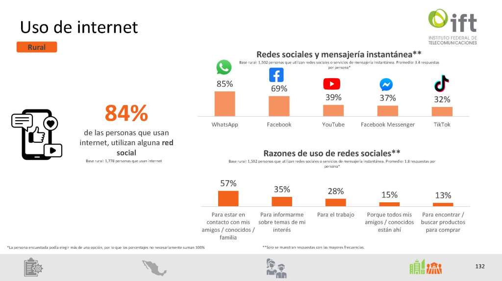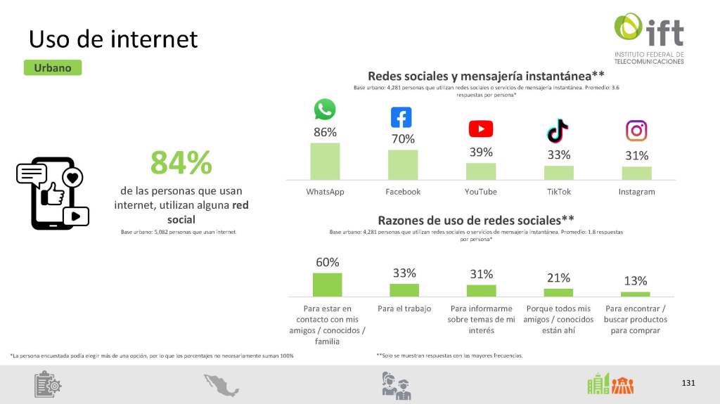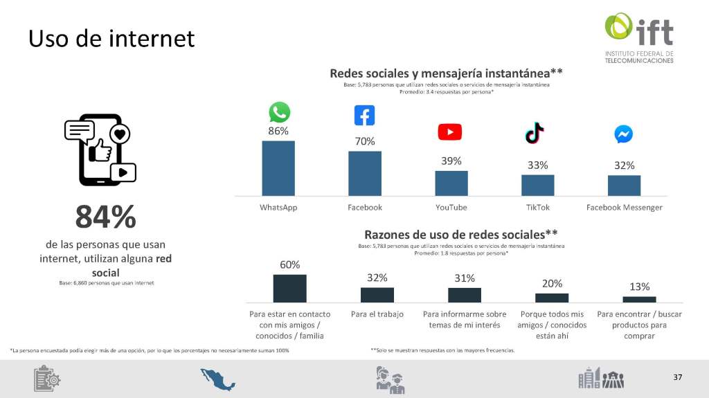 La Encuesta Nacional de Consumo de Contenidos Audiovisuales realizada por el Instituto Federal de Telecomunicaciones (IFT) en todo el país, confirmó la presencia contundente que el teléfono celular tiene en prácticamente la totalidad de las y los mexicanos, ya que la mayoría de su consumo audiovisual lo hacen a través de dicho dispositivo donde las redes sociales son la columna vertebral, ya que permiten a las personas allegarse de información, entretenimiento, recreación e interactuar con sus familiares, seres queridos, amigos y compañeros del trabajo y/o escuela.
