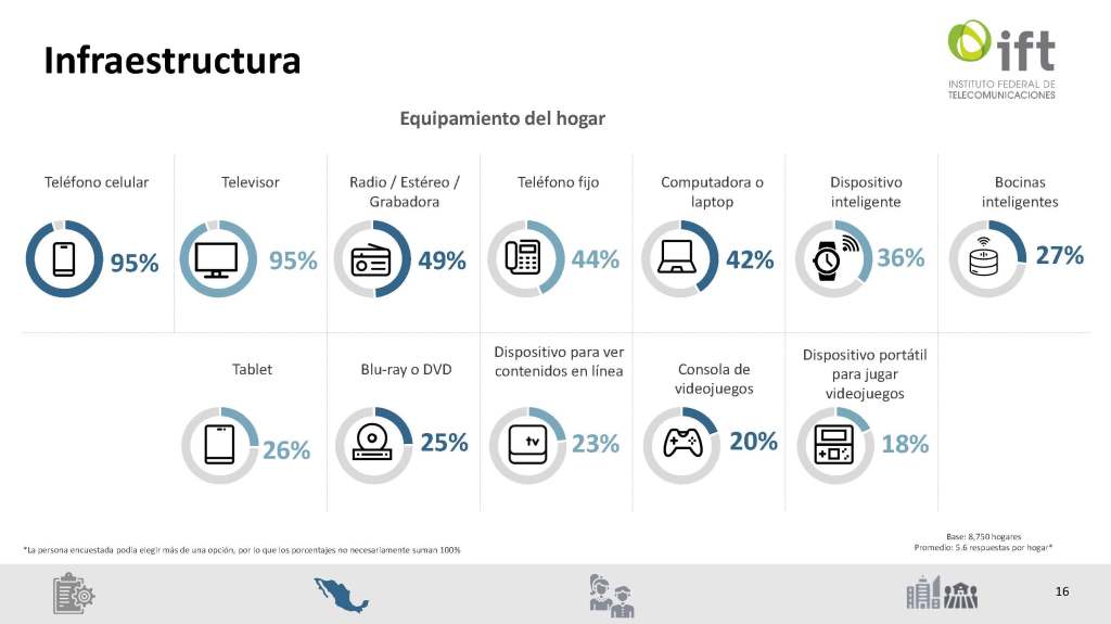 La Encuesta aplicado de manera presencia, cara a cara, en 8 mil 750 hogares (la más grande del país sobre dicho tema) por el IFT, precisa que 95% de los hogares tiene un teléfono móvil, de los cuales 87% son smartphone; la presencia del televisor también llega a 95%; mientras que la radio solo está presente en 49% de las casas mexicanas.