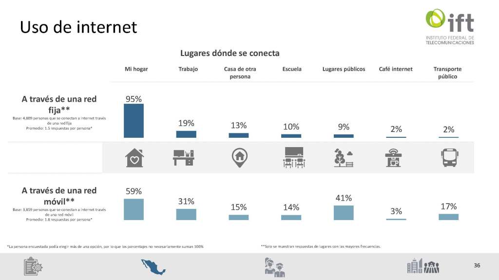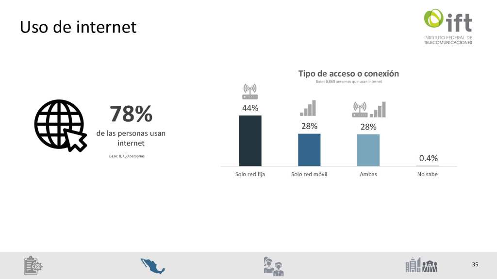 Entre los hallazgos de la Encuesta, realizada a mayores de 7 años en los 32 estados que integran a la República mexicana, está que 78% de los entrevistados declararon utilizar internet y un 84% de ellos alguna red social; así como que el teléfono celular es el dispositivo que más se usa para consumir contenidos por internet por un 81%, seguido de Smart TV con un 37%.