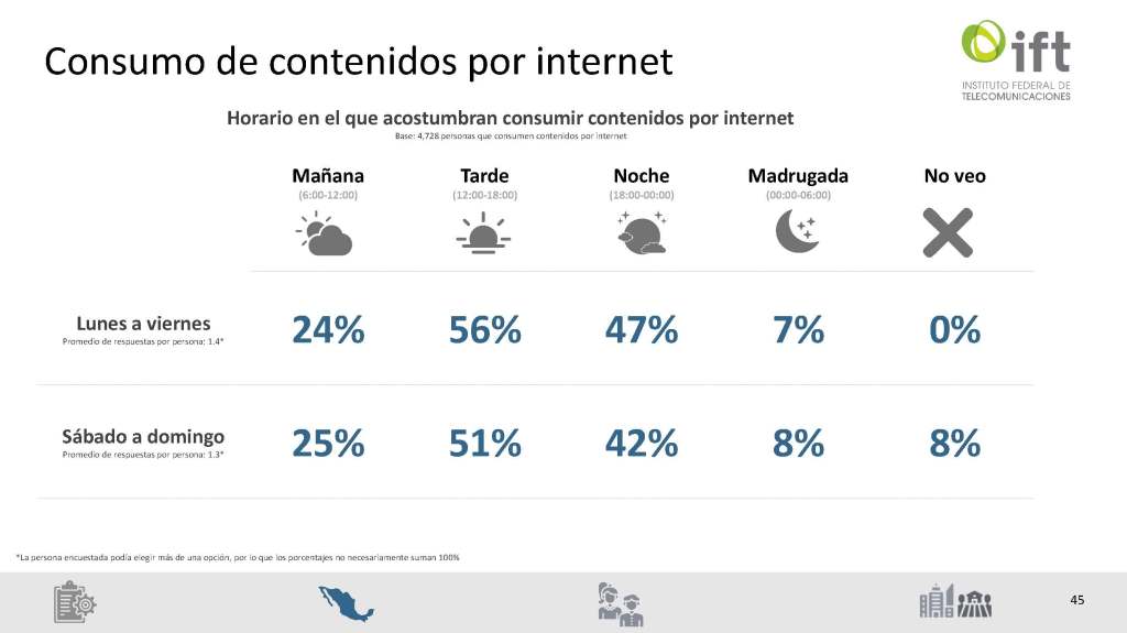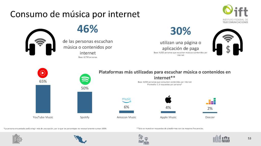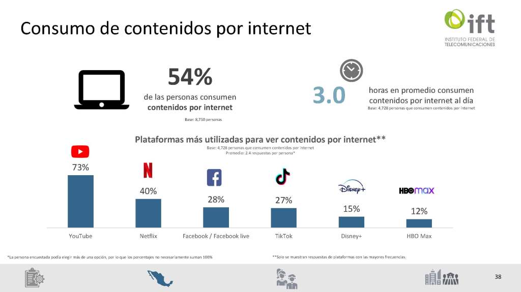 También confirma que la plataforma de YouTube es utilizada por el 73% de las personas que consumen contenidos por internet, seguido por Netflix con un 40% y que 51% de las personas que ven contenidos por internet pagan una suscripción periódica, mientras que el 80% usan páginas o aplicaciones que no requieren de un pago.