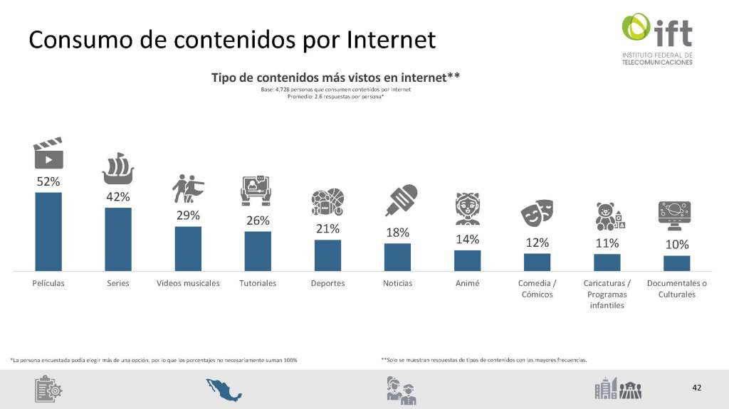 El 52% de los entrevistados que indicaron consumir contenidos por internet, precisa la Encuesta del IFT, ven con mayor frecuencia películas; seguido por series con el 47% y, videos musicales con 29%.