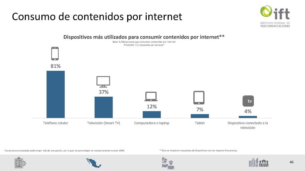 Otro dato destacado de la Encuesta aplicada por el IFT advierte que “54% de los entrevistados indican que consumen contenidos audiovisuales por internet; 46% de las personas escuchan contenidos de audio o música por internet y 22% dijo jugar videojuegos, de entre ellos, el 59% lo hace en internet. El teléfono celular es el dispositivo más utilizado para estos fines”, puntualiza el IFT.