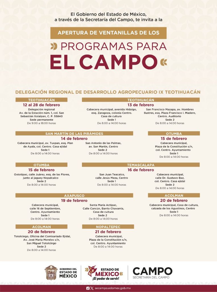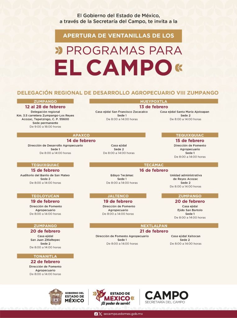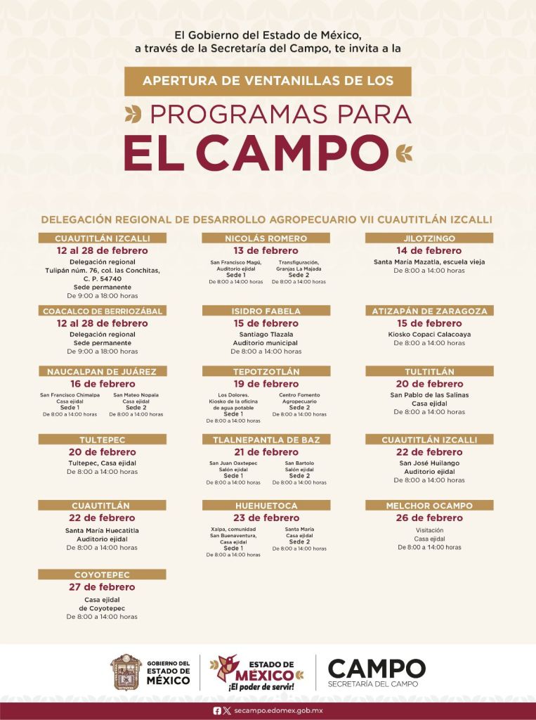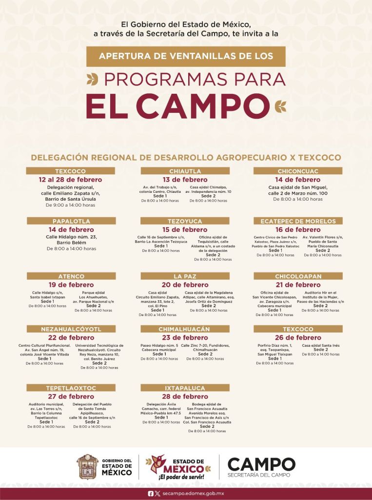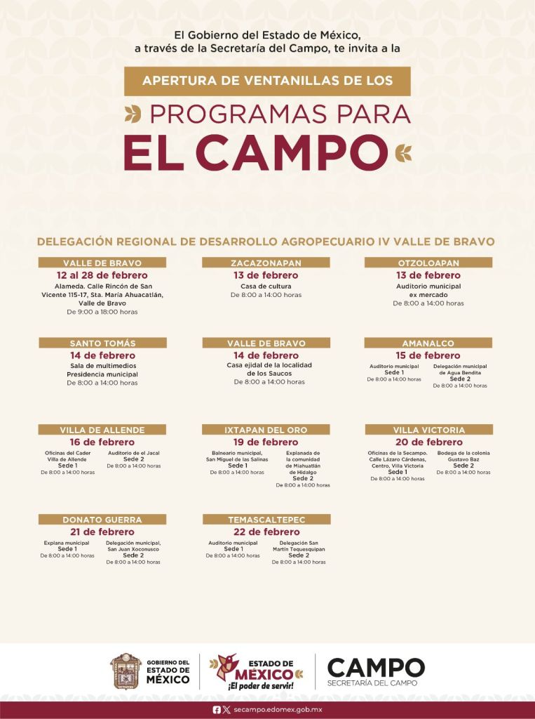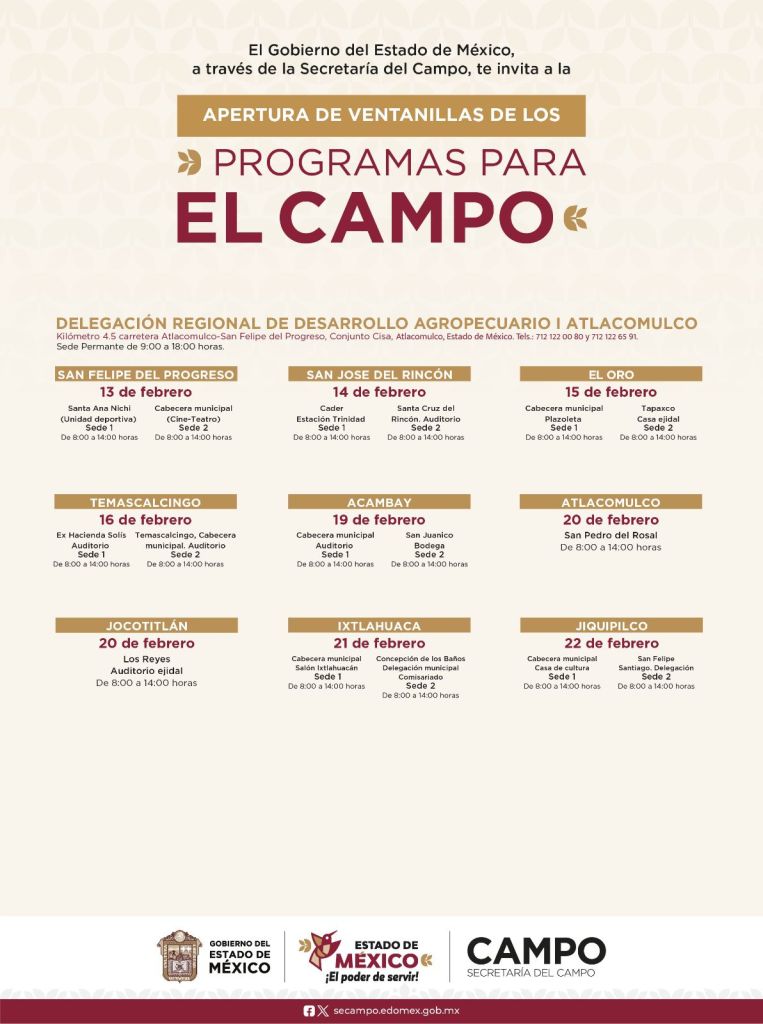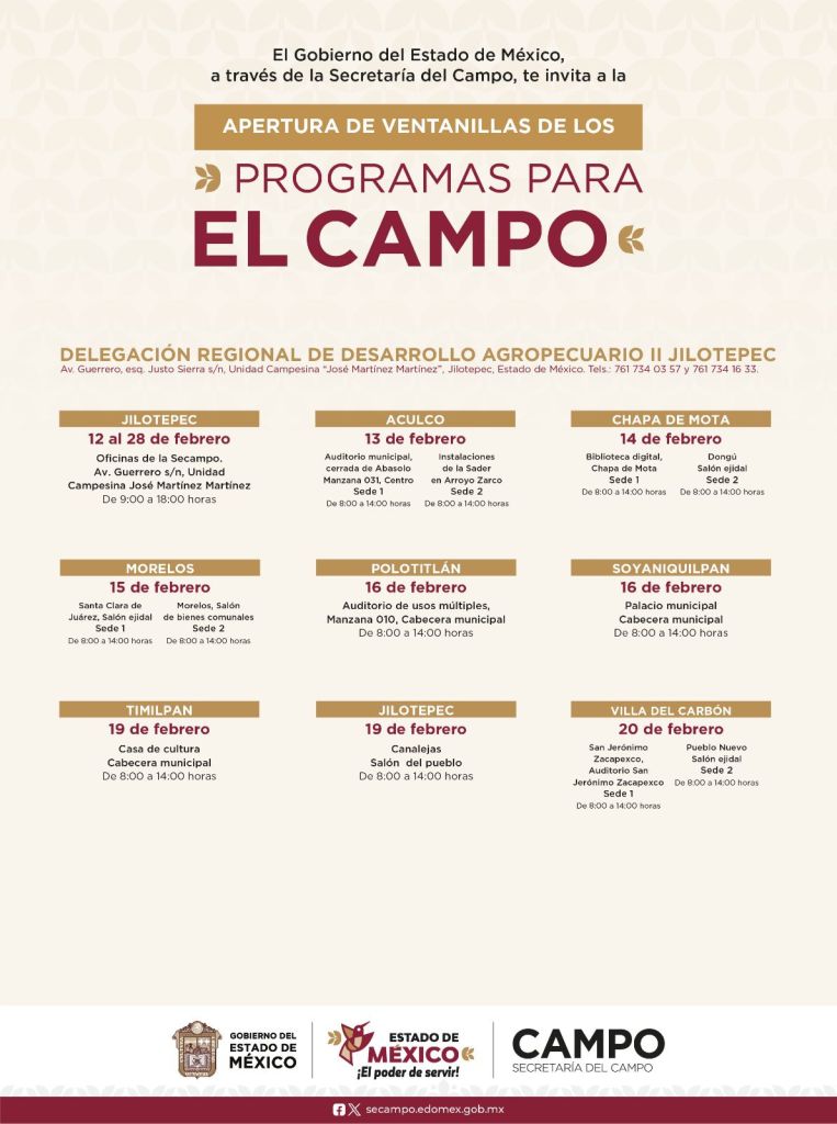 Del 12 al 28 de febrero se atenderá en las ventanillas de las 11 delegaciones de la Secretaría del Campo a las personas que deseen inscribirse a los programas del sector agropecuario en un horario de las 09:00 a las 18:00 horas.