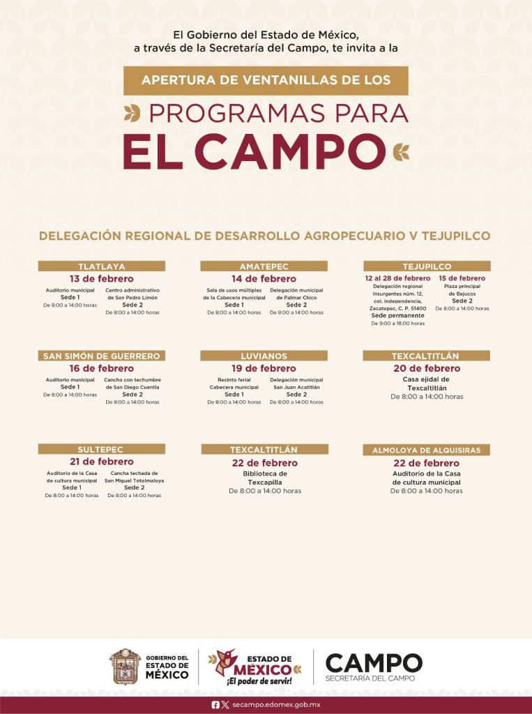 Para honrar el compromiso de la Gobernadora del Estado de México, Delfina Gómez Álvarez de llevar apoyo a las regiones olvidadas por administraciones anteriores, la Secretaría del Campo que encabeza María Eugenia Rojano Valdés, reforzará la inscripción a los programas “Por el Rescate del Campo” y “Transformando el Campo” mediante caravanas itinerantes en la entidad.