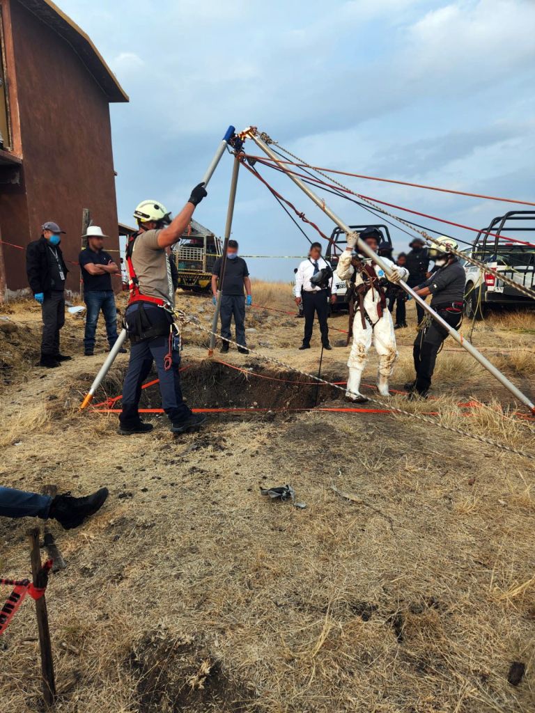 En ese momento, durante la diligencia, fue localizada una excavación a la cual las autoridades identificaron como “Pozo Uno” cuyas dimensiones aproximadas son de cuatro metros de diámetro por 40 de profundidad.