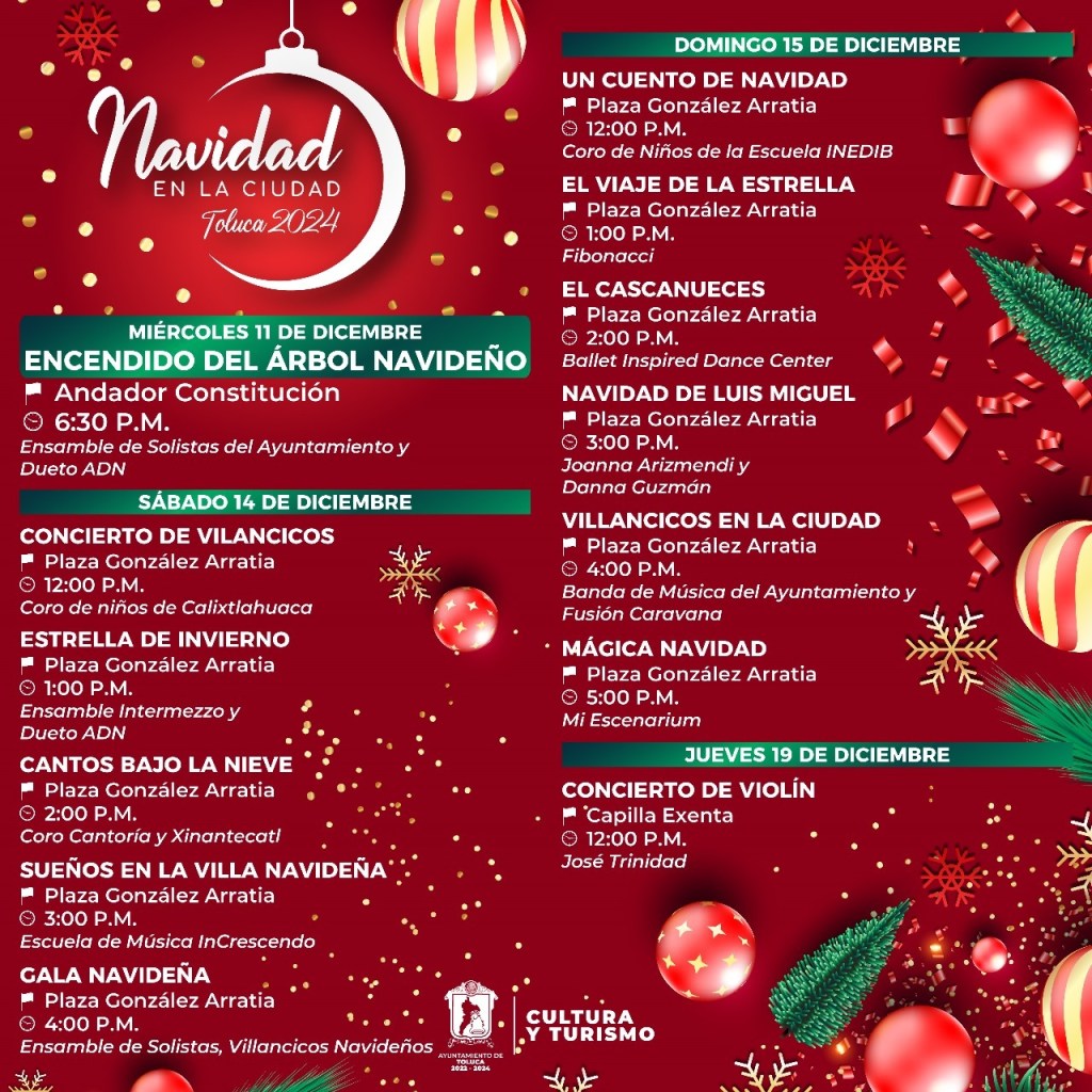 El sábado 14, la Plaza González Arratia se vestirá de fiesta con el concierto de villancicos del Coro de Niños de Calixtlahuaca, a las 12:00 horas; el espectáculo Estrella de Invierno, con el Ensamble Intermezzo y el Dueto ADN a las 13:00; Cantos Bajo la Nieve del Coro Cantoría y Xinantécatl, a las 14:00 horas; Sueños en la Villa Navideña de la Escuela de Música InCrescendo a las 15:00, y Gala Navideña, del Ensamble de Solistas a las 16:00 horas.