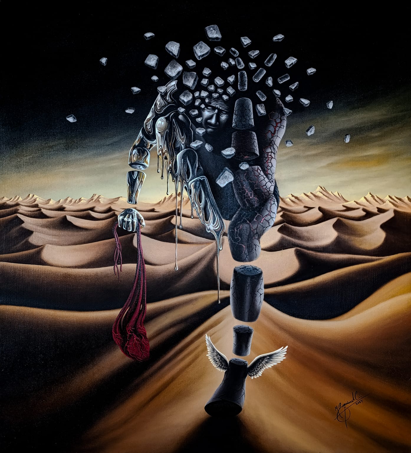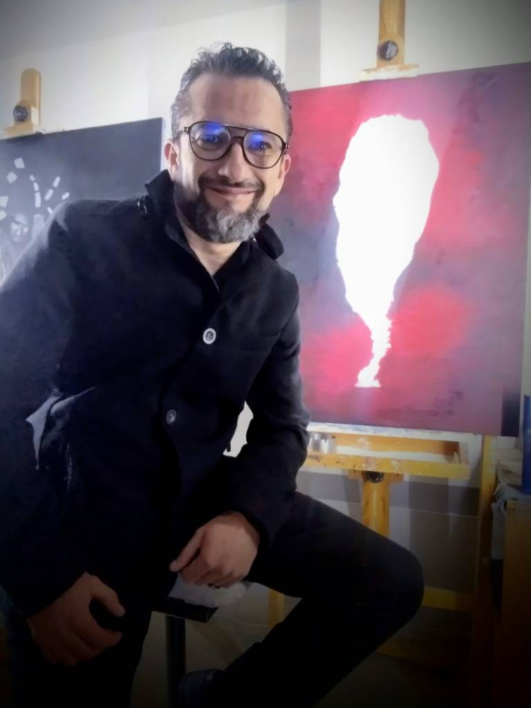 Surge además una dimensión más filosófica y simbólicamente estructurada. El artista comienza a pintar el pensamiento, la conciencia, la interioridad como territorios formales. Geometrías, estructuras mentales y figuras arquetípicas aparecen integradas en composiciones que proponen no solo contemplación, sino lectura simbólica. Las obras ya no son sólo emoción visual: son mapas del alma, arquitecturas del sentir.