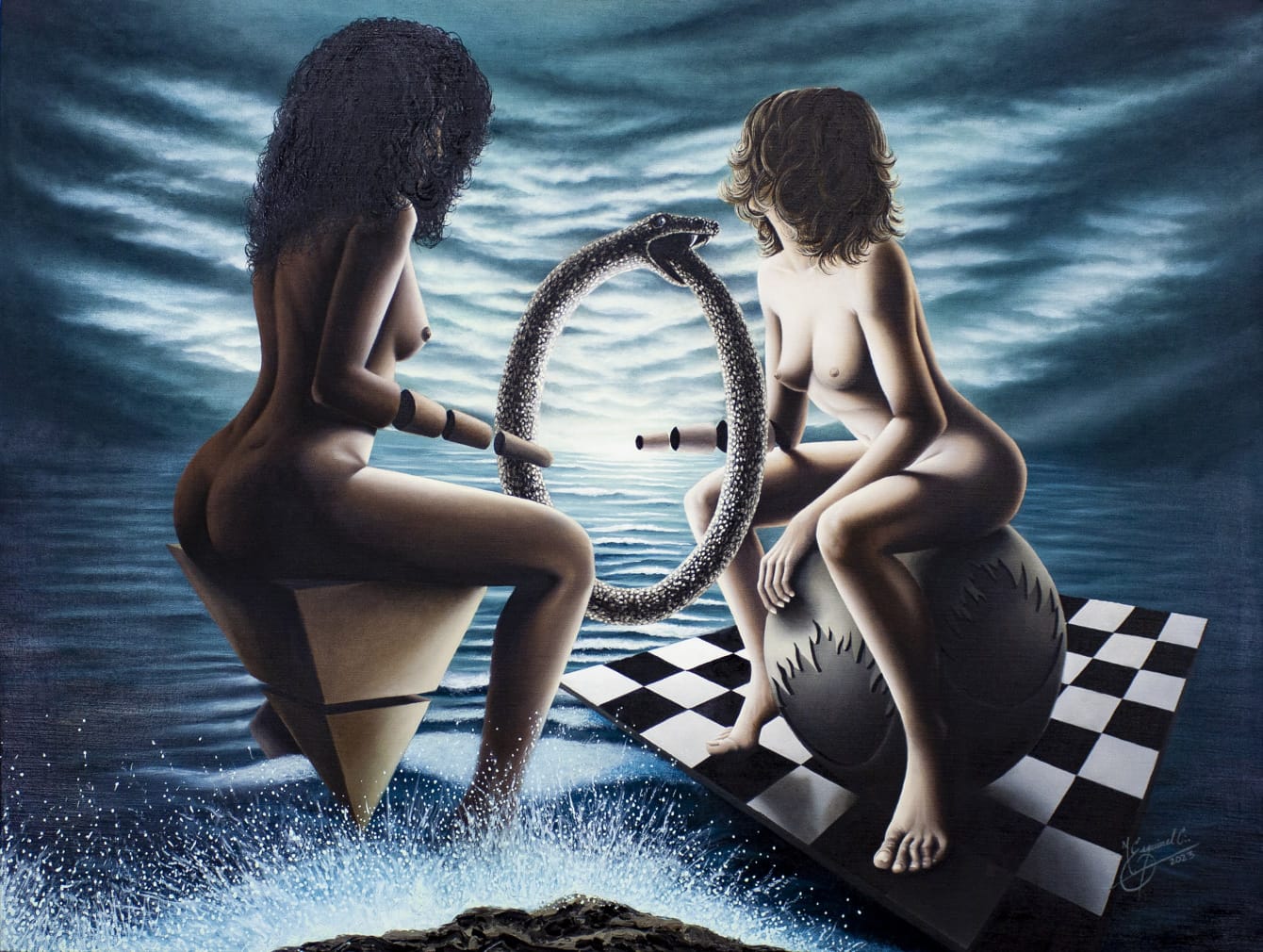 Por su parte, la quinta etapa representa una profundización espiritual. Aquí, Esquivel se mueve hacia lo metafísico, abordando temas como la introspección, el alma y el deseo de trascendencia. Las composiciones se vuelven más etéreas, los cuerpos más simbólicos. Hay una clara intención de elevar el lenguaje visual hacia lo místico, sin abandonar el hiperrealismo que ha caracterizado su estilo. En estas obras, la piel, la postura y la mirada se convierten en canales para hablar del alma humana, de su fragilidad y su anhelo de luz.