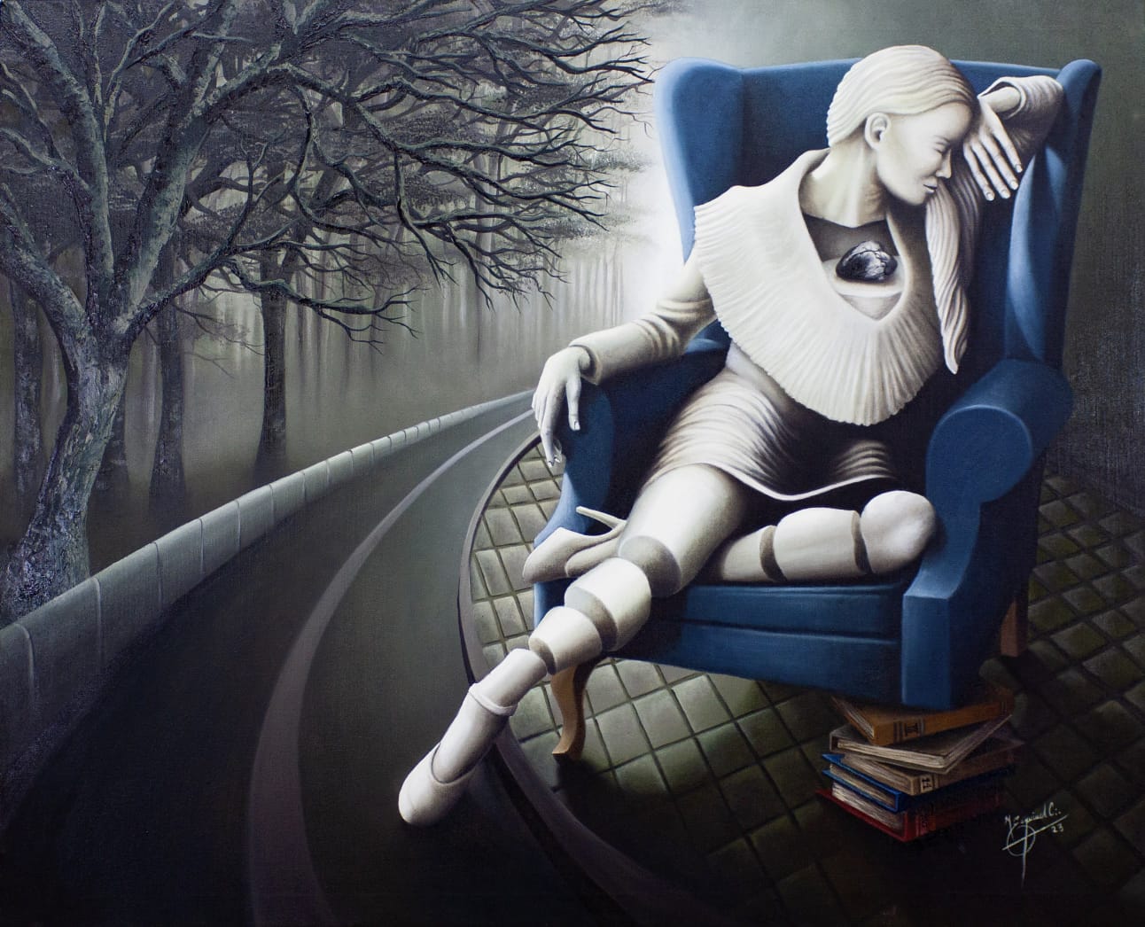 La figura humana continúa siendo central, pero ahora aparece menos desgarrada, más contemplativa. Se despliega en escenarios silenciosos, habitaciones suspendidas en el tiempo, paisajes internos donde lo emocional no es explosión, sino eco, pausa, susurro. La presencia de lo simbólico se mantiene, pero adquiere otra textura: ya no se impone con crudeza, sino que se sugiere como un pensamiento oculto bajo la imagen.
