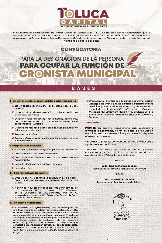 El Presidente Municipal de Toluca Ricardo Moreno firmó dicha convocatoria, en la cual la Secretaría del Ayuntamiento será la encargada de analizar el cumplimiento de los requisitos, y una vez evaluadas las propuestas, el alcalde someterá a consideración del Cabildo la designación del Cronista Municipal de Toluca.