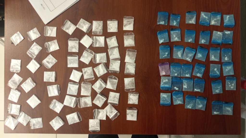 Luego de presentarse como policías estatales y municipales, se les solicitó una inspección y al término aseguraron 35 bolsas plásticas que contenían una sustancia granulada, color blanco, con las características de la droga conocida como cristal y 56 más con polvo blanco, posiblemente cocaína.
