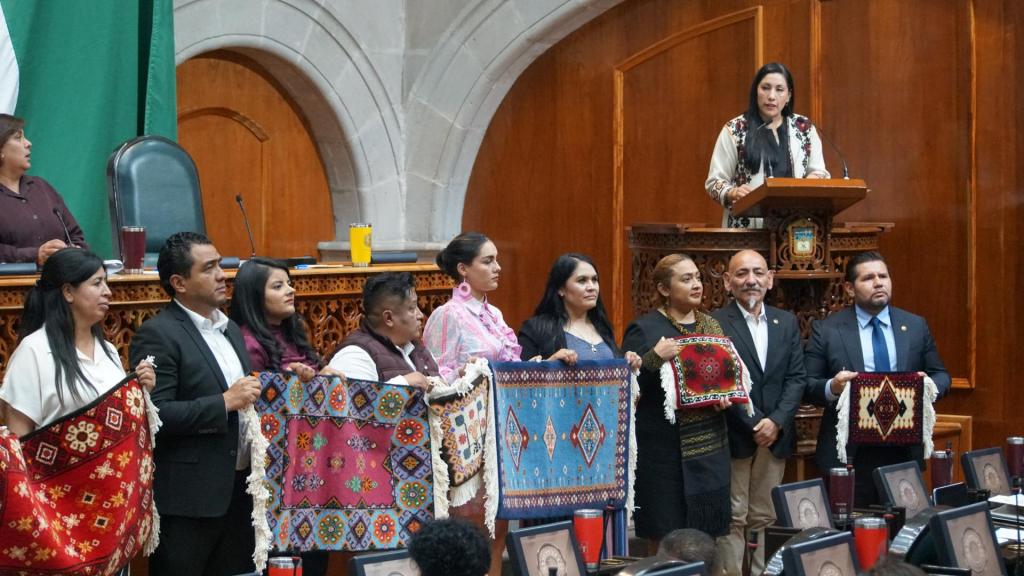 La legisladora de morena realizó un recuento de cómo amplios sectores de la población de Temoaya, en su gran mayoría de origen otomí, cuentan con la destreza, conocimiento y capacidad para elaborar un gran número de prendas y el tradicional tapete del municipio.