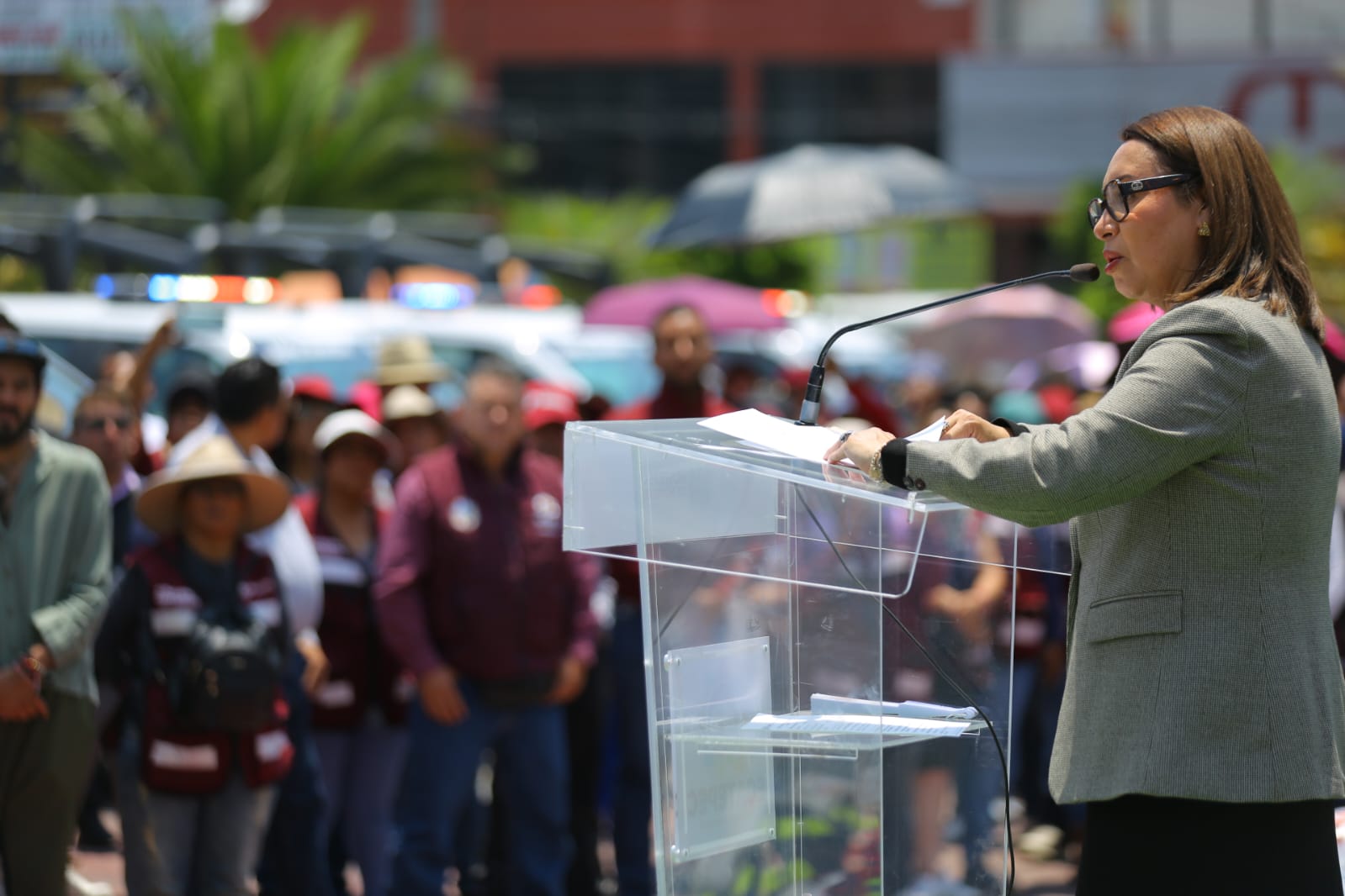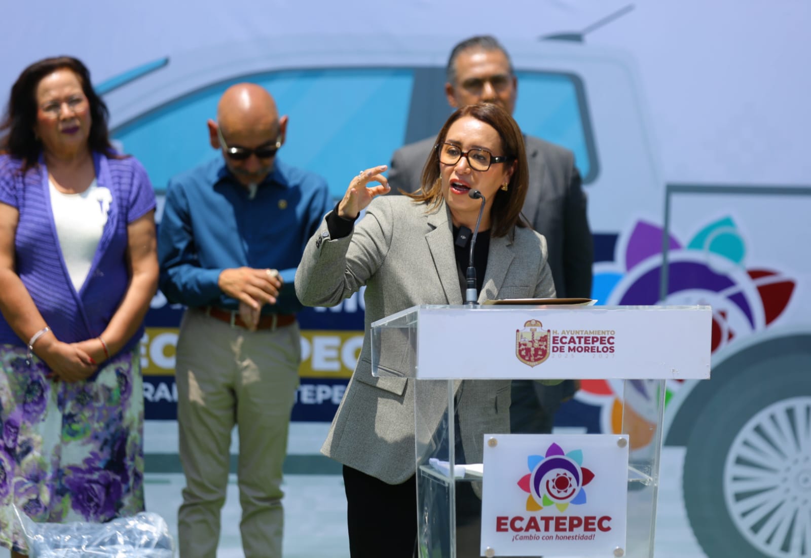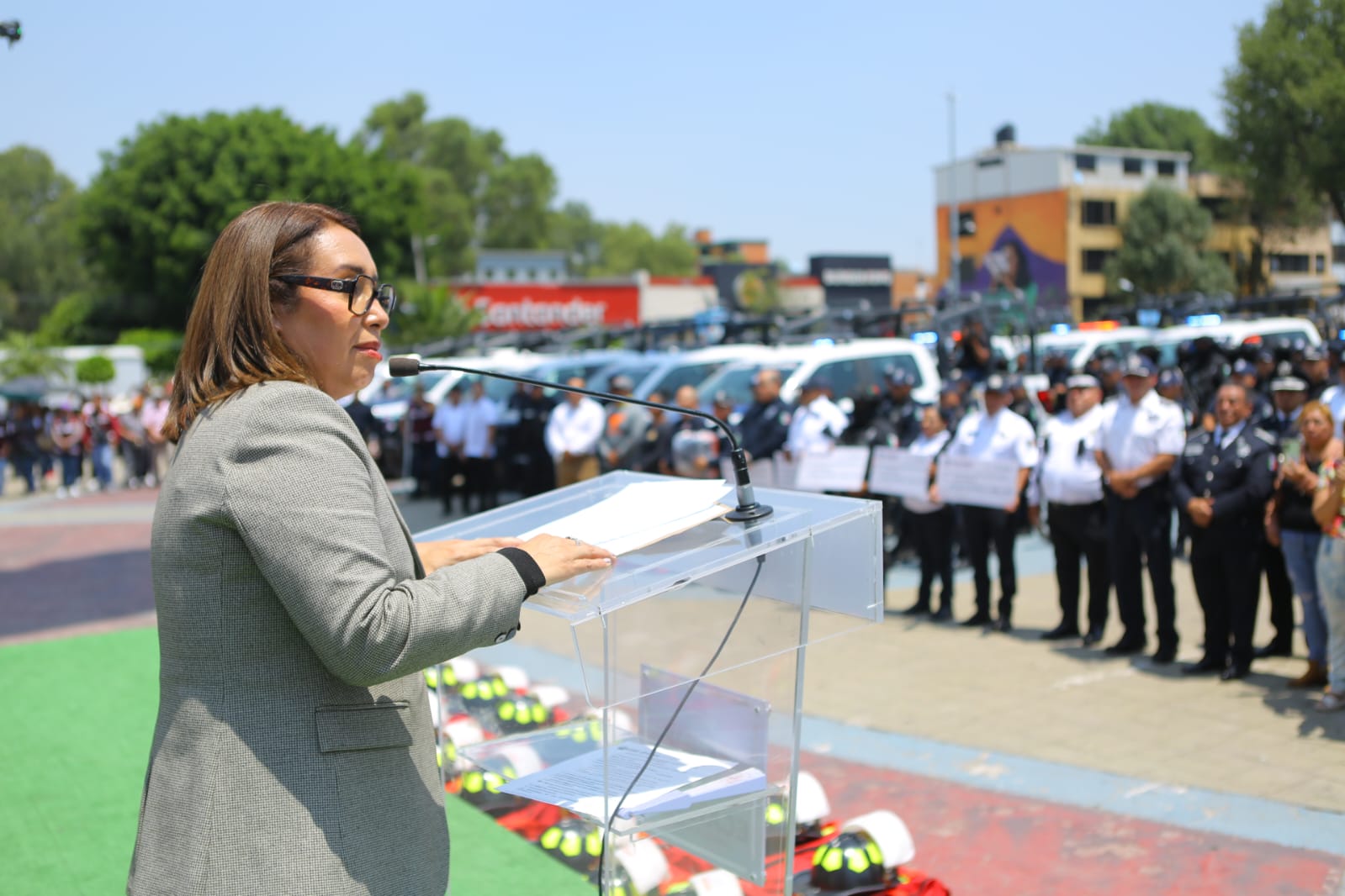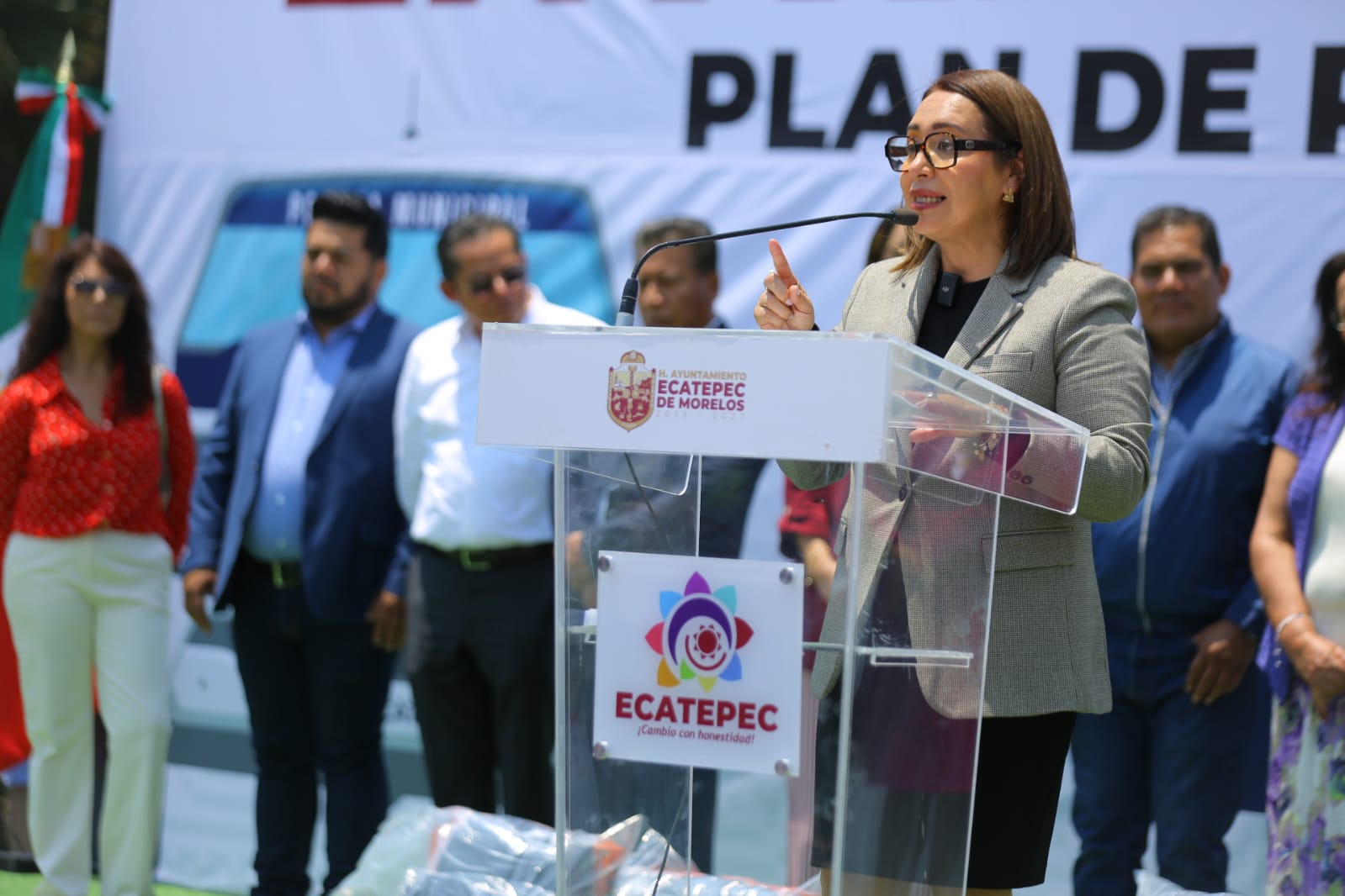 En la explanada municipal, acompañada de regidores y diputados locales y federales, la alcaldesa recordó que recibió un gobierno con saqueo y abandonado; y en seguridad se encontró sin lo mínimo indispensable para que trabajaran los uniformados, porque incluso dejaron sin vehículos para patrullar.