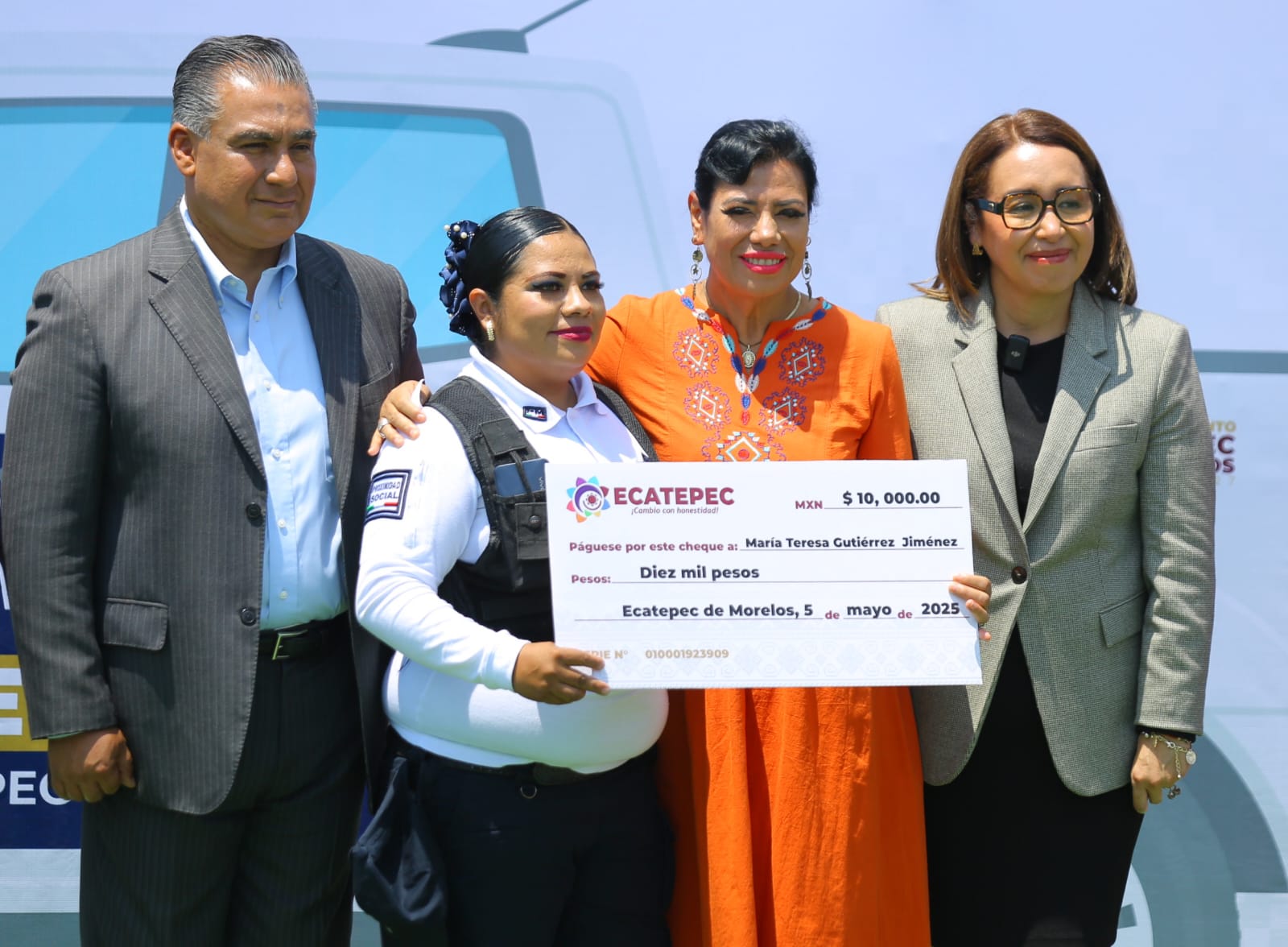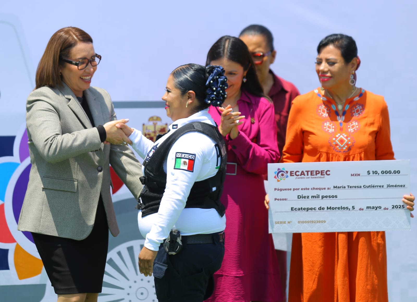 Azucena Cisneros entregó estímulos económicos por 10 mil pesos a cinco policías: Omar Said Guardado Moreno, del C4, por elaborar productos de inteligencia y estadísticas; Eugenio Isaías Quiroz, de la Célula de Búsqueda, por la evacuación de una mujer que se encontraba en riesgo en la Sierra de Guadalupe; José Francisco Desiderio Tapia, del Grupo de Operaciones Especiales, por lograr diversas detenciones de portación de armas de uso exclusivo del ejército y robo de vehículo con violencia; María Teresa Gutiérrez Jiménez, de Proximidad Social, por asistir a una mujer en labor de parto y al recién nacido, y Juan José Cabrera Espinosa, de la Dirección Operativa, por participar en detenciones de personas vinculadas con robos a tiendas de conveniencia.