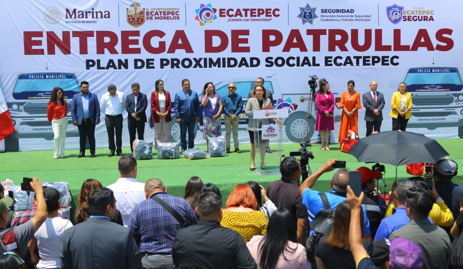 Con la entrega de las primeras 80 patrullas de un total de 394, uniformes y reconocimientos económicos a policías municipales se avanza en la transformación de la corporación, cuyos principales objetivos son la cercanía con la gente y hacer de Ecatepec un municipio de paz, afirmó la presidenta municipal Azucena Cisneros Coss.