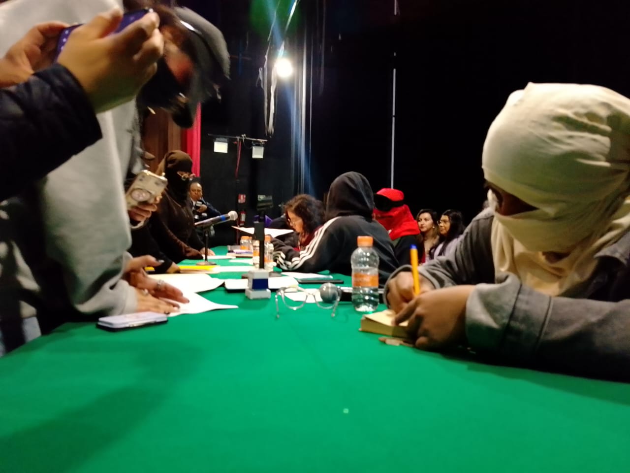 Zarza Delgado observaba con atención a la o el estudiante encapuchado que le reclamaba e insultaba, las y los miraba a los ojos y al final de cada intervención observaba a la moderadora de la reunión para saber si se le concedía la palabra.