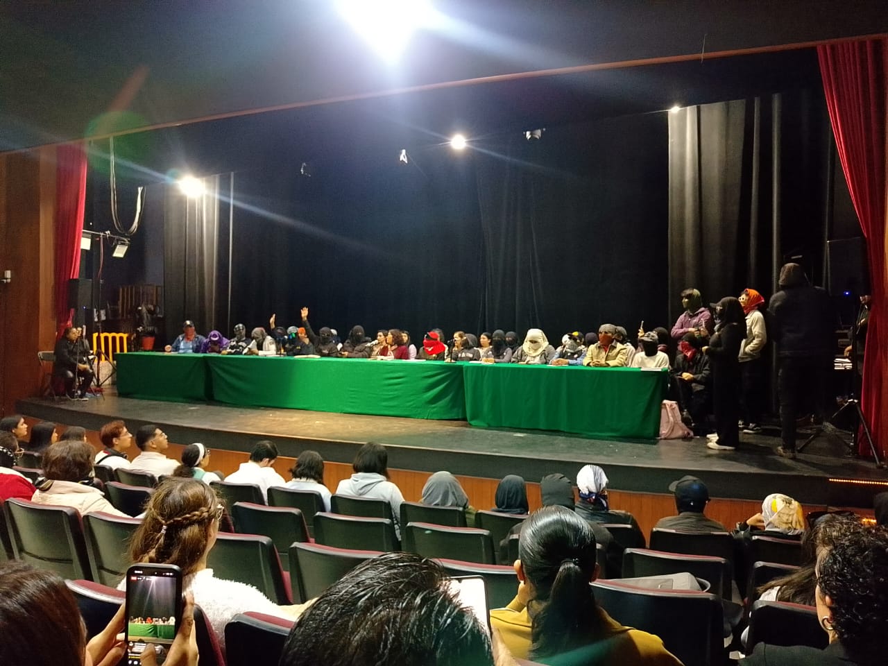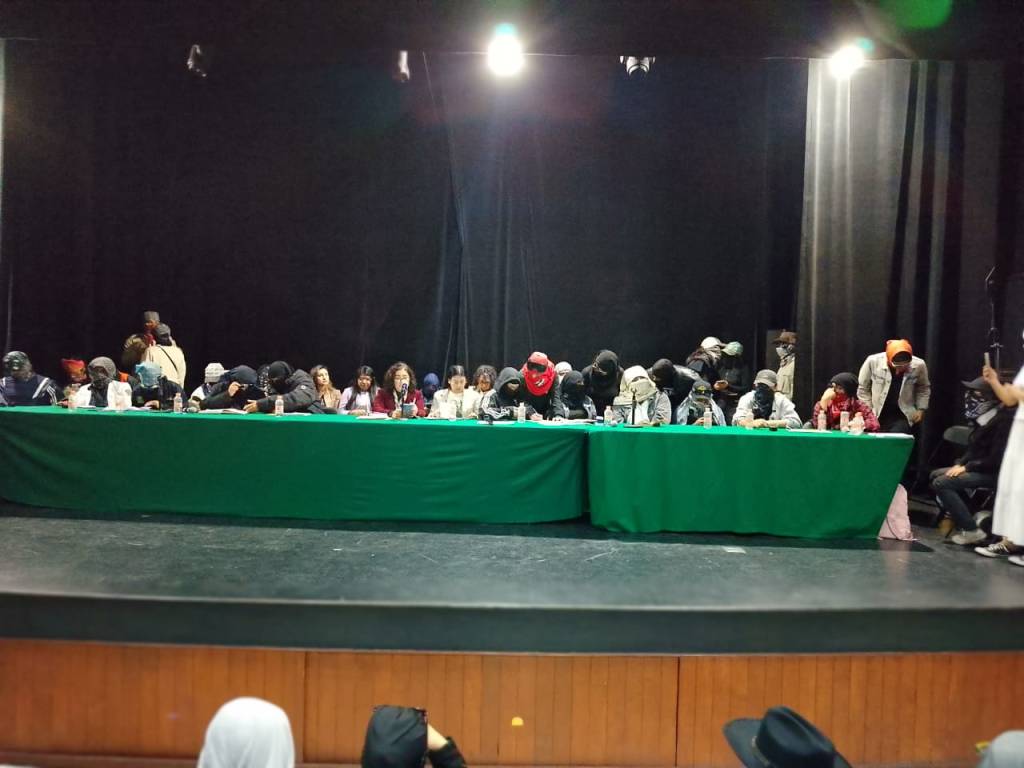 A las 12:20 horas, al escenario del teatro Los Jaguares, llegaron alrededor de 76 estudiantes paristas, en su gran mayoría mujeres, a la mesa se sentaron 31 alumnas y alumnos, todos con el rostro cubierto, el resto ocupó las primeras butacas del escenario y uno que otro con el rostro descubierto; en dicha zona también se ubicaron no más de 20 integrantes del Consejo Universitario (máximo órgano de decisión de la UAEMéx) de un total 115 que lo conforman; al centro se colocó la Doctora Patricia Zarza Delgado, y atrás de ella cinco de sus jóvenes colaboradoras.