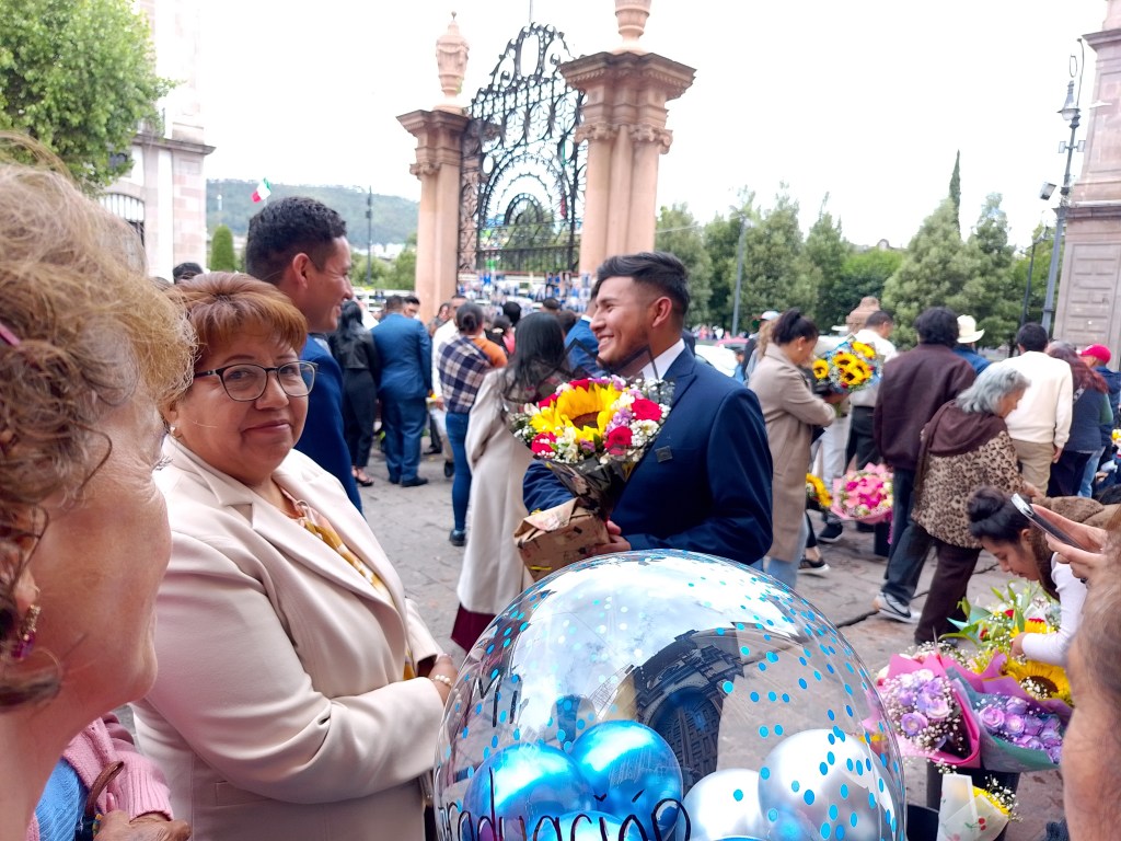 «No todos los días se gradúa un hijo, y pues estoy muy contenta», dijo una de las Mamás que solicitó permiso en el trabajo para esperar a su hijo con un enorme ramo de flores y globos.