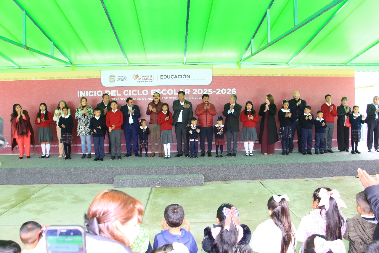 El líder magisterial también acompañó a la Gobernadora Delfina Gómez Álvarez en la Escuela Primaria Paulino Martínez, en Coyotepec, durante la puesta en marcha de la Estrategia integral para el bienestar de la comunidad escolar 2025-2026, que incluyó la entrega de útiles, mobiliario e infraestructura a planteles de la región.